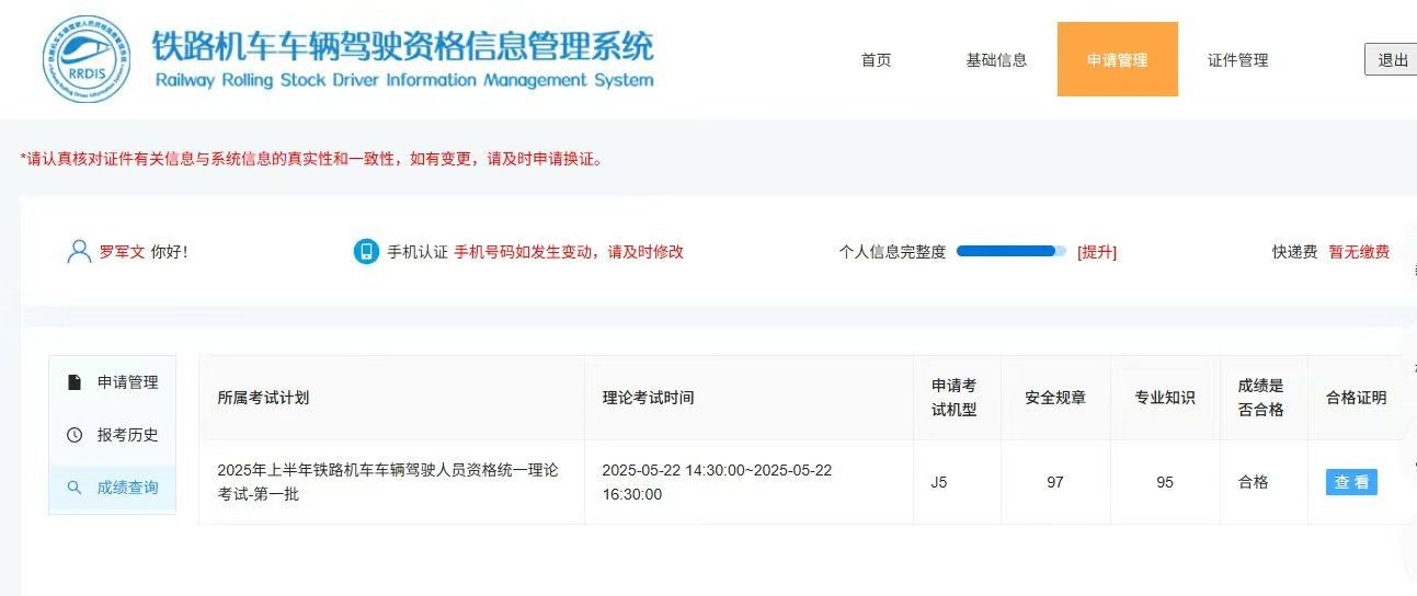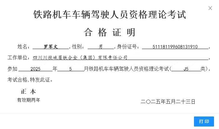 國家鐵路局鐵路機車車輛駕駛人員資格考試作為國家級行業考試,由國家鐵路局統一組織。在公司的統籌安排和支持下,今年4至5月,該員工全脫產參與了中鐵成都局組織的鐵路機車車輛駕駛人員全封閉式集中培訓。培訓時長超過40天,在高強度的學習任務與緊張的培訓節奏下,該員工憑借毅力與努力,以扎實的理論基礎取得了優異成績,理論考試兩門科目《安全規章》和《專業知識》分別拿下97分和95分的高分,綜合評定成績合格。
